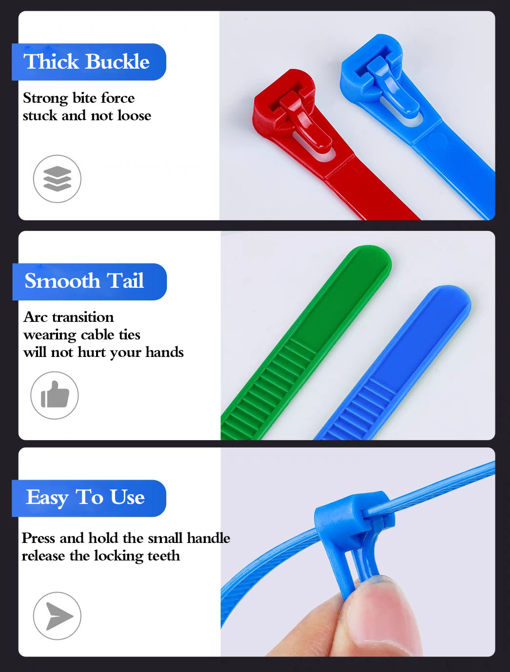 【Spänne med självlåsande design】 Varje buntband har en hållbar självlåsande mekanism som låser mycket säkert och inte kommer att röra sig med tiden, och låständerna stoppar buntbandet vid önskad längd. Lätt att använda och rakt på sak. Det lösa spännet löser problemet med engångsanvändning som vanliga buntband har, och det lösa spännet gör att buntbandet kan återanvändas.