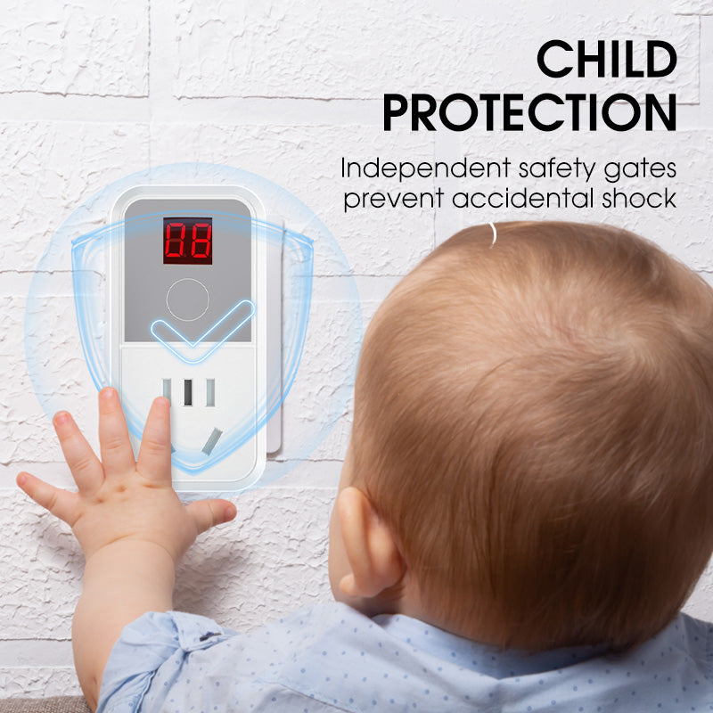 ÖKAD BARNSÄKERHET - Integrerar oberoende barnsäkerhetsluckor i varje uttag, vilket erbjuder flera lager av skydd. Dessa säkerhetsluckor förhindrar att nyfikna barn av misstag för in föremål, skyddar effektivt mot risker för elektriska stötar och skapar en säkrare miljö för små barn i alla hushåll.