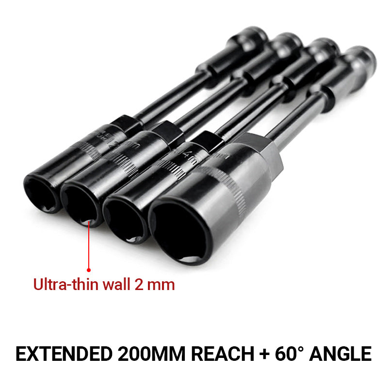 FÖRLÄNGD RÄCKHÅLL PÅ 200 MM + 60° VINKEL – Nå in i trånga motorutrymmen, smala fack eller djupt in i maskiner utan att behöva montera isär delar. Det vinklade huvudet ger optimal hävstångseffekt i besvärliga utrymmen, vilket minskar handbelastningen och sparar tid vid komplexa reparationer.