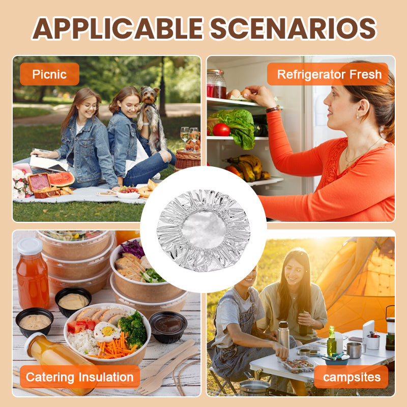 Vill du hÄlla maten varm lÀnge och förhindra att den svalnar? Detta aluminiumfolie film isoleringsskydd lÄser inte bara temperaturen under en lÀngre tid, utan kan ocksÄ vÀrmas i mikrovÄgsugn. Det Àr starkt och hÄllbart samt kan Ätervinnas, vilket gör din matupplevelse mer bekvÀm!