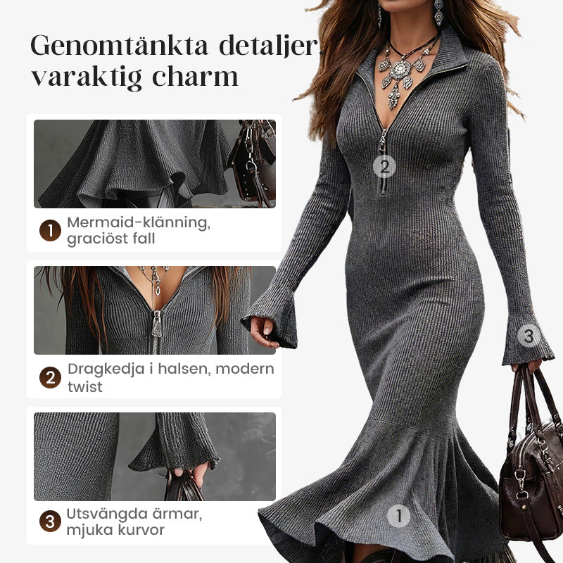 Damklänning med dragkedja, slag och förlängda ärmar i stickat material, med fiskstjärtkant.